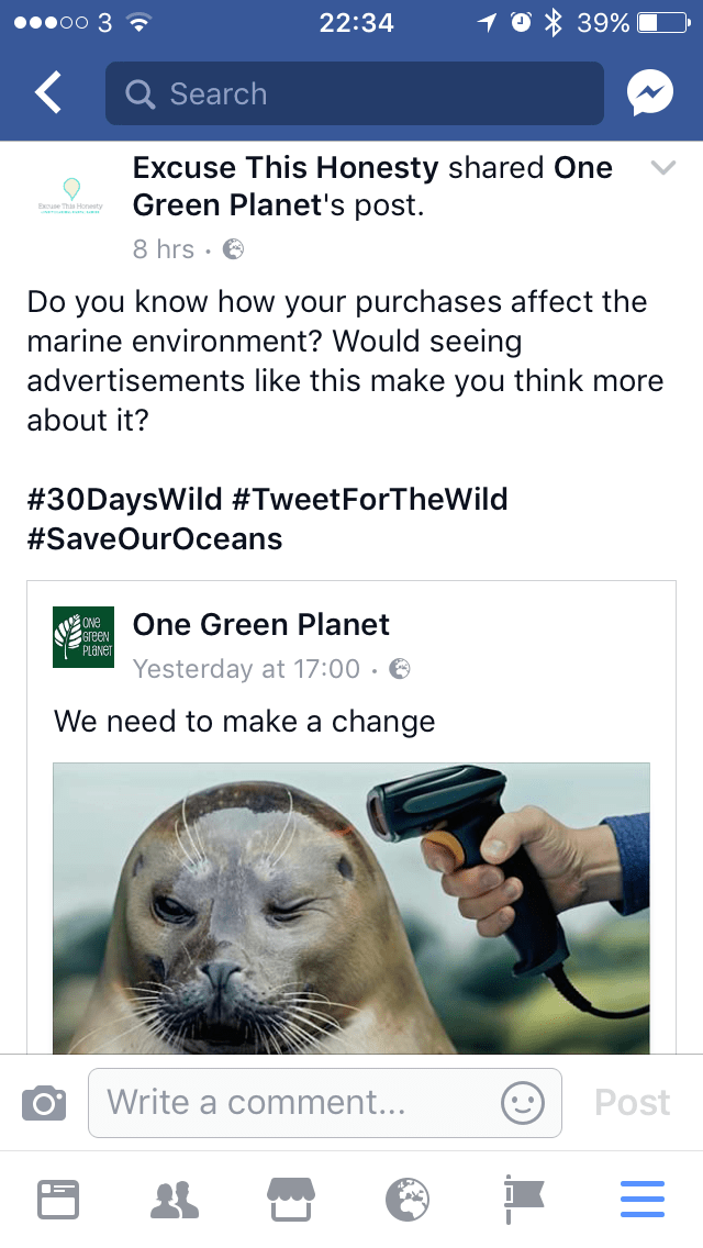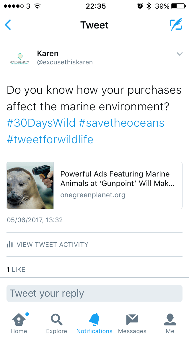 So, although it’s something that you can often find me doing anyway, today I took it upon myself to tweet for wildlife at dinnertime. I found a great article about realistic adverts for purchases which showed a marine animal with a barcode scanner pointing to their head in a threatening way. The whole idea of these pictures is to make people think about the harm their purchase will do to the ocean… and as someone who loves the ocean and wants to keep it healthy… I just had to share it!